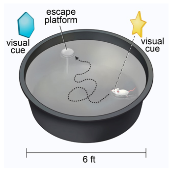图片 | 莫里斯水迷宫实验。为了测试学习和记忆能力,实验人员将小鼠放入一个装有逃生平台的水池中。水池周围设置了视觉提示,帮助小鼠导航至逃生平台。