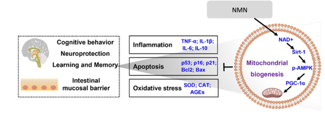 图片| 结果总结。NMN通过提升细胞 NAD+ 水平改善大脑和肠道健康。NAD+ 激活 Sirt-1,进而激活与长寿相关的酶 AMPK,AMPK 进而激活线粒体生物合成的主要调节因子 PGC-1⍺。线粒体生物合成,即新线粒体的产生,可以抵消线粒体功能障碍,减少炎症、细胞凋亡和氧化应激(蓝色标记物)。