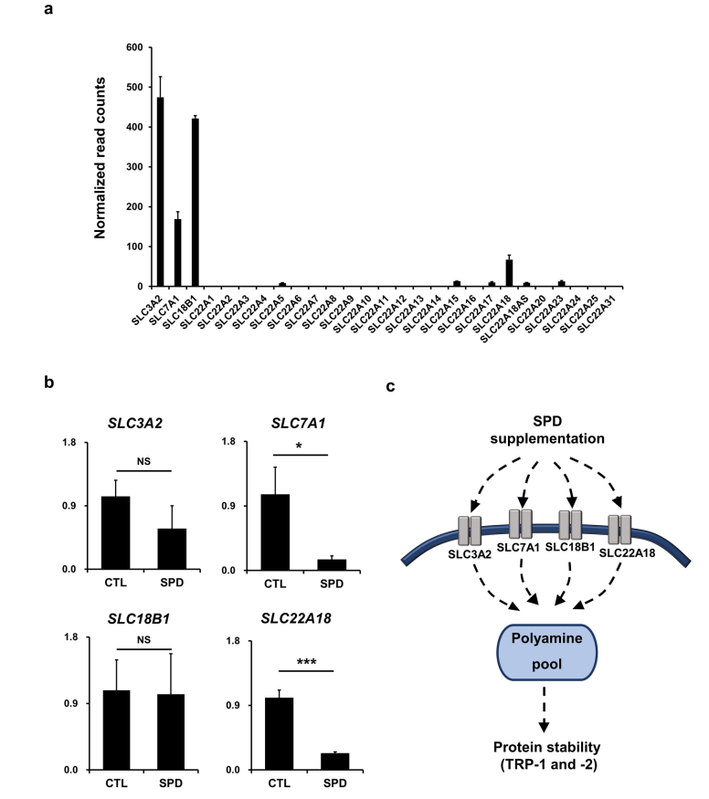 为了证明亚精胺可调节涉及蛋白质降解的基因,研究团队通过系统检测亚精胺处理后的细胞发现有181个基因下调和82个基因上调,其中不包括黑色素生成相关的基因。为了进一步证明,研究团队分析了亚精胺对酪氨酸酶基因家族TYR、TRP-1和TRP-2表达水平的影响,这些基因是紧密调节黑色素生成的基因。mRNA表达水平证实了亚精胺不会改变黑色素生成相关基因的表达。但是有几个基因的活性被亚精胺改变并且与蛋白质降解有关,几个改变的基因与 ubiquition 有关,ubiquition 是一种与黑色素生成相关的蛋白质降解系统