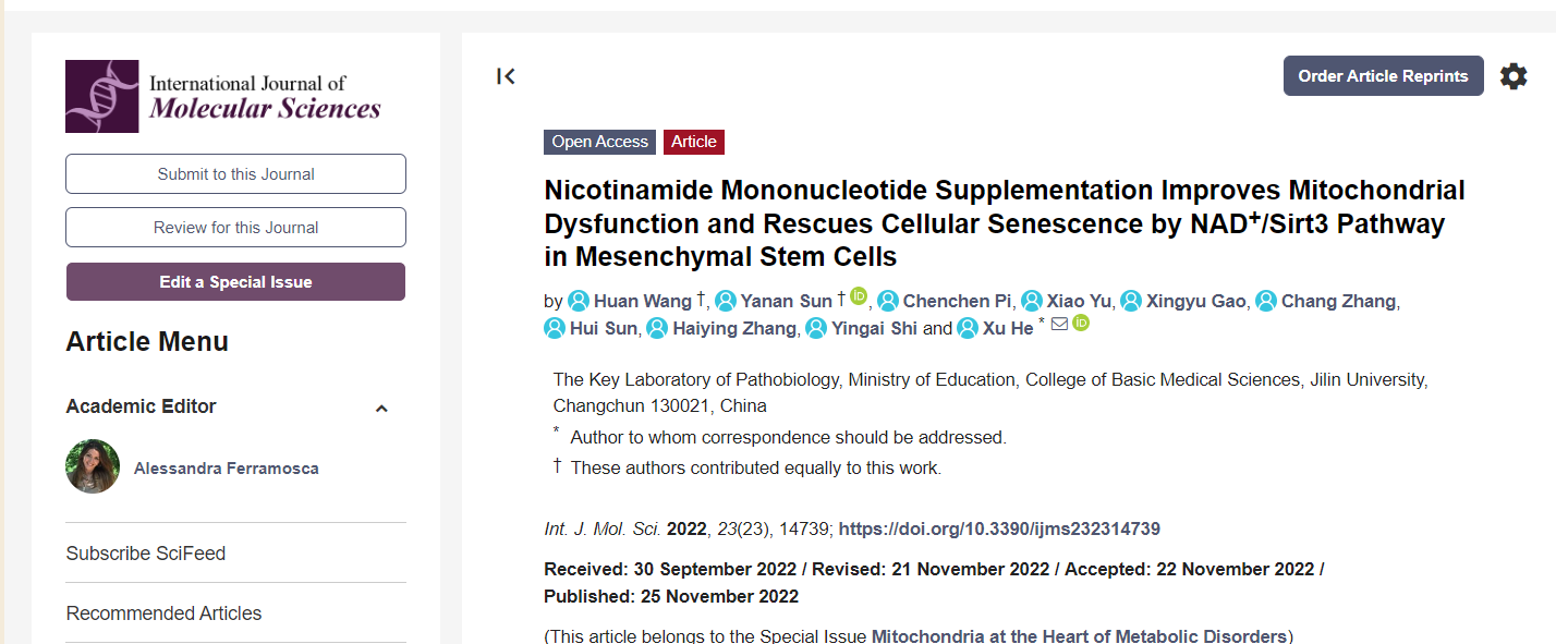 2022年11月,吉林大学的研究团队在《International Journal of Molecular Sciences》期刊发表题为“Nicotinamide Mononucleotide Supplementation Improves Mitochondrial Dysfunction and Rescues Cellular Senescence by NAD+/Sirt3 Pathway in Mesenchymal Stem Cells.”研究论文。